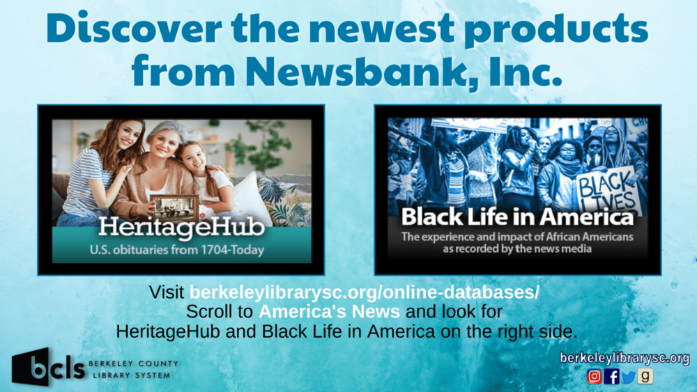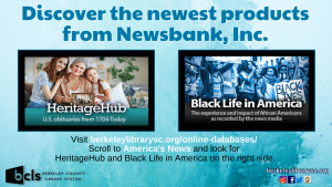 Berkeley County Library System is proud to announce the immediate availability of the addition of new and updated resources from NewsBank, Inc. to our online database. Visit https://infoweb. newsbank.com/apps/news/easy- search?p=NewsBank