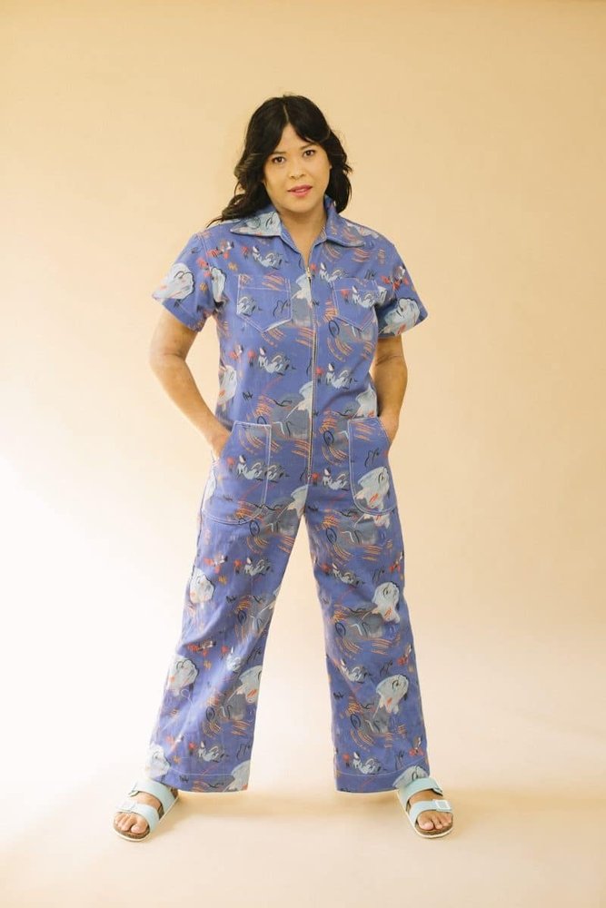Guevara created Art Coveralls during her residency as a Visiting Artist at the Gibbes Museum from May 3rd to 30th, 2021. The artist created digital paintings and then made them into repeating patterns to be printed onto fabric. She then cut and sewed these into workwear coveralls to demonstrate all the skilled labor involved in clothing production while in the studio at the Gibbes Museum. The artist shows the joyful creation of another world where fashion is not destructive and harmful, instead full of delight and possibility.