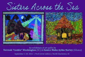 The City of North Charleston’s Cultural Arts Department is pleased to announce that a joint exhibition of art quilts by local artist Torreah “Cookie” Washington and Ghanaian artist Eunice Maku Aiyku-Nartey will be on display at Park Circle Gallery from September 1-30, 2021. A free reception will be held at the gallery on Friday, September 10th, from 5 pm to 7 pm. Cookie and Eunice will have a Zoom conversation about their works and artistic processes at 6pm. The public is invited to attend.