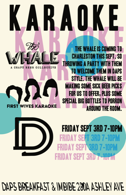 In advance of their late summer opening, The Whale continues to pop up around town with their friends in the local food and beverage industry. Next up, The Whale and Daps Breakfast + Imbibe collaborate on a fun and festive night of karaoke with First Wives Karaoke. Usually only open for breakfast and lunch, Daps will open in the evening for this event. In addition to karaoke, The Whale will be pouring a selection of beers handpicked for the occasion.
