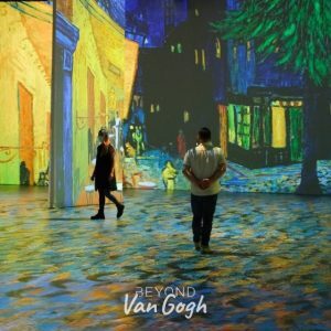 Beyond Van Gogh’s website says the event “uses cutting-edge projection technology to create an engaging journey into the world of Van Gogh. Using his dreams, his thoughts, and his words to drive the experience as a narrative, we move along projection swathed walls wrapped in light, colour, and shapes that swirl, dance and refocus into flowers, cafes and landscapes. Masterpieces, now freed from frames, come alive, appear and disappear, flow across multi-surfaces, the minutia of details titillating our heightened senses. Through his own words set to a symphonic score, we may come to a new appreciation of this tortured artist’s stunning work.”