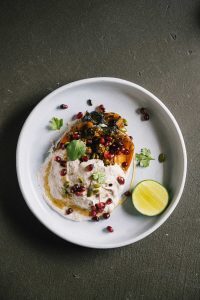 The dish consists of roasted green poblano chiles stuffed with chorizo and pepitas, topped with a white walnut cream sauce, cinnamon and brown sugar, and sprinkled with pomegranate seeds and parsley, with colors mirroring Mexico’s flag.