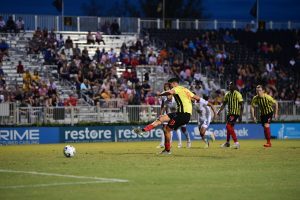 In what was expected to be in an intense match between the rival clubs, the first start of the match was no exception. Claudio Repetto won an early free kick in Tampa Bay’s defensive third in the 7th minute, which prompted a Battery free kick. AJ Paterson received the free kick and fired a shot inside the 18 yard box that drew a hand ball from Jordan Scarlett, awarding a penalty to the Battery and a yellow card to Scarlett. Repetto was called upon for the penalty kick and made no mistake, driving the ball into the bottom left corner, opposite goalkeeper Evan Louro’s guess.