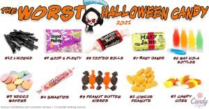 CandyStore.com also shared the country’s least favorite Halloween candies. Candy Corn “topped” that list, followed by Circus Peanuts, Peanut Butter Kisses, Smarties, and Necco Wafers.