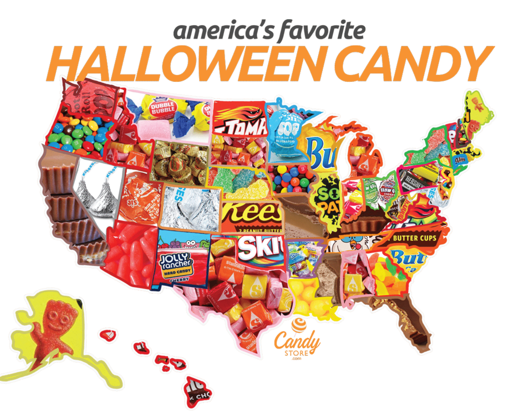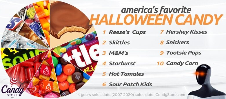 The country’s favorite Halloween is Reese’s Cups, followed by Skittles, M&Ms, Starburst, and Hot Tamales.