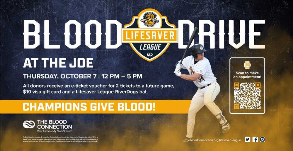 The blood drive is Thursday, October 7th, at Joseph P. Riley, Jr. park located at 360 Fishburne Street from noon to 5 pm. Each blood donor will receive 2 tickets to a future RiverDogs game, as well as a Lifesaver League hat and a $10 visa gift card.