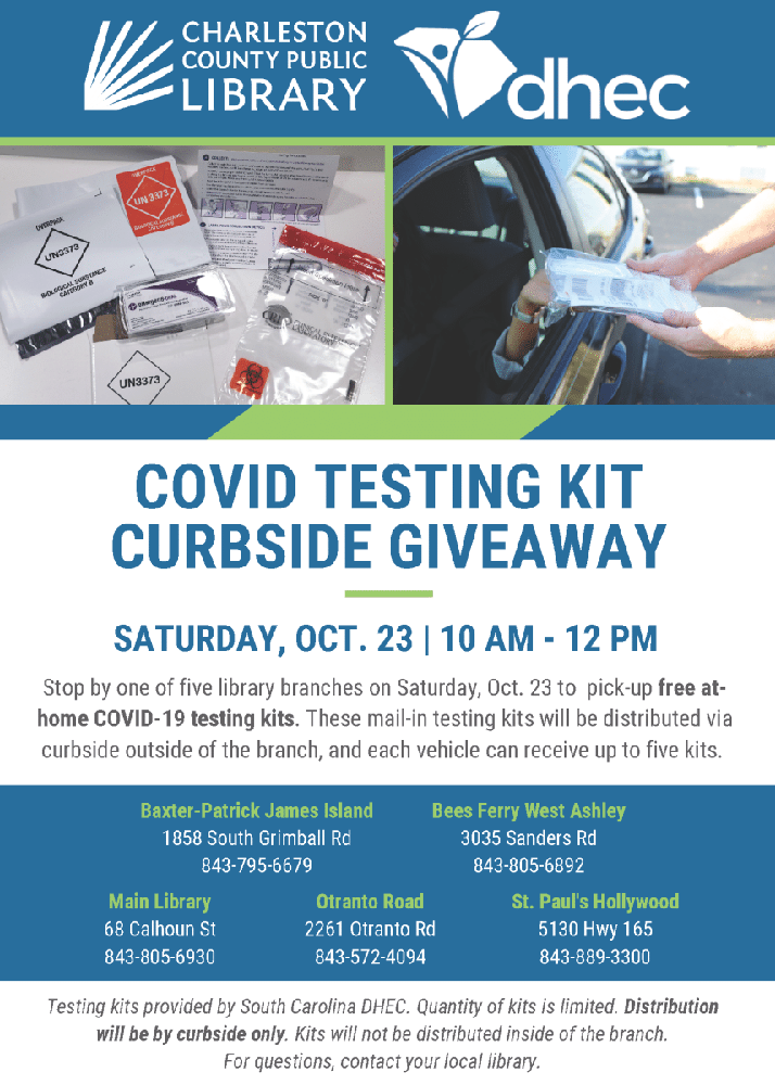 The testing kits will be distributed, while supplies last, through curbside pickup service outside of the branch. Each vehicle can receive up to five kits. Patrons will not be able to obtain a testing kit inside of a library branch. “Libraries are all about access and we wanted to help our partners at DHEC in their effort to connect our communities to the opportunity of owning a free COVID-19 test, should they need it,” said CCPL Deputy Director of Innovation Natalie Hauff. “We are also grateful for passionate staff members who have poured their hearts into our community during this pandemic. Events like this would not be possible without their tireless efforts.”