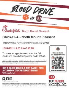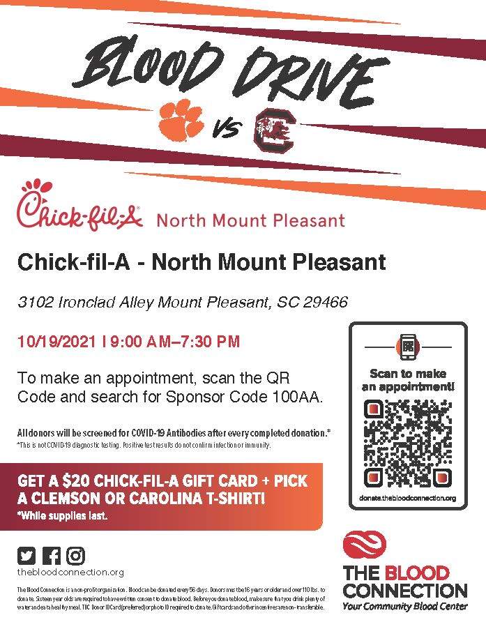 The third Chick-fil-A North Mount Pleasant blood drive is on October 19th at 3102 Ironclad Alley. This is an all-day blood drive lasting from 9am to 7:30pm. Each donor will receive a $20 Chick-fil-A gift card as well as a Clemson or Carolina blood donor t-shirt. Appointments are strongly encouraged and can be made here. If you’d like to save lives and host a blood drive, click here. TBC is the primary blood provider for Lowcountry hospitals including Trident Health System, Roper St. Francis Healthcare and MUSC hospitals.