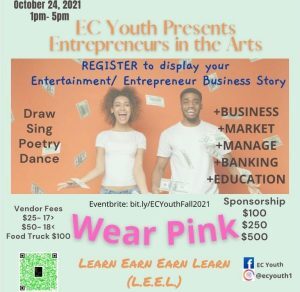 Keeping in line with October as Breast Cancer Awareness Month, this year, EC Youth is selling pink men’s awareness t-shirts to remind people that “men breasts matter 2.” EC Youth’s “ALL INN (Increase, Networth, Network)” t-shirts will also be for sale. The organization is still accepting business vendors (youth and adult), food vendors and trucks, and sponsors for this weekend’s event. Vendor spots, sponsorship, and pre-ordered t-shirts can all be purchased, along with donations given, via Eventbrite.com under EC Youth Presents: Financial Literacy – Making Money in the Arts. EC Youth Founder and CEO Pleshette Grant states that she is excited about providing opportunities like this event to inform youth about financial literacy through business education at an early age.