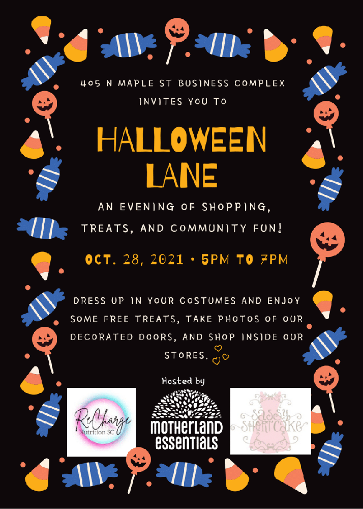 Halloween Lane will take place at their warehouse on Thursday, October 28th, 2021 from 5 pm to 7 pm. Their address is 405 N Maple St, Suite B1, in Summerville.