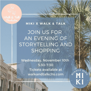Partnering retailers are located on the strip of historic King Street between Calhoun and Market that’s home to some of Charleston’s oldest and most beloved stores. Participating MiKi retailers include Croghan’s Jewel Box, Finicky Filly, Hampden, Jackson Davenport, Jordan Lash, M. Dumas & Sons, Shoes on King, The Boutique (new 2021 member).