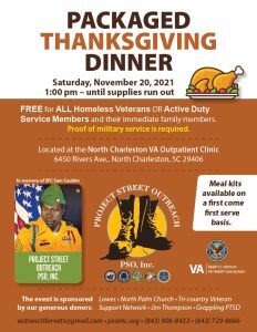 The Ralph H. Johnson VA Health Care System will distribute pre-packaged Thanksgiving dinner meal kits to Veterans-in-need and their families beginning at 1 pm on Saturday, November 20th, 2021 in the parking lot of the North Charleston VA Outpatient Clinic located at 6450 Rivers Ave.