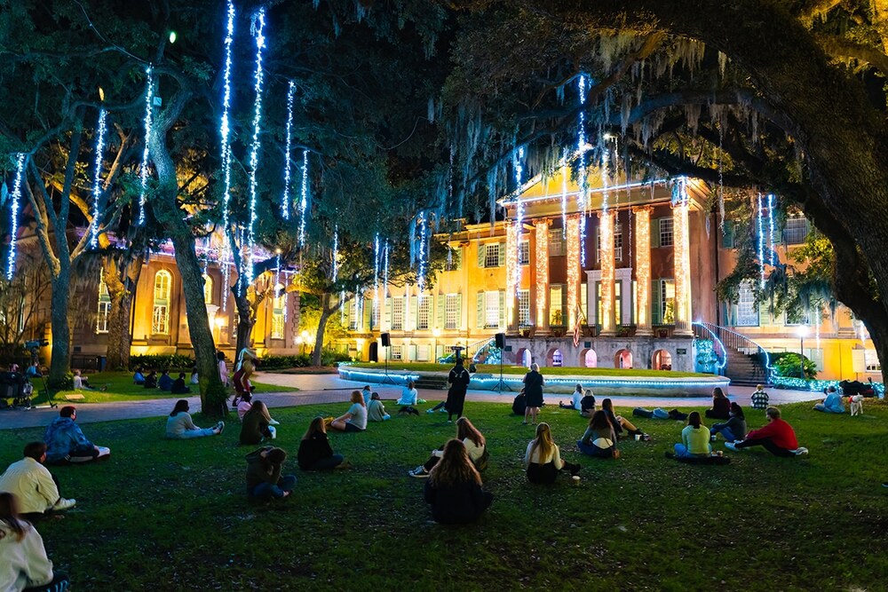 Bedecked in old oak boughs and Spanish moss splendor, the College of Charleston’s Cistern Yard is charming year-round. But something quite magical happens to Randolph Hall during the holiday season.