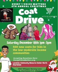 The nonprofit’s overall mission is to improve the quality of life for children and their families. Every 1 Voice Matters has set out to give away over 500 coats to kids in the low to moderate income areas of Charleston this holiday season. Community leaders such as Calvin King Jenkins and organizations like Acts of Kindness, USA are joining in on this effort.