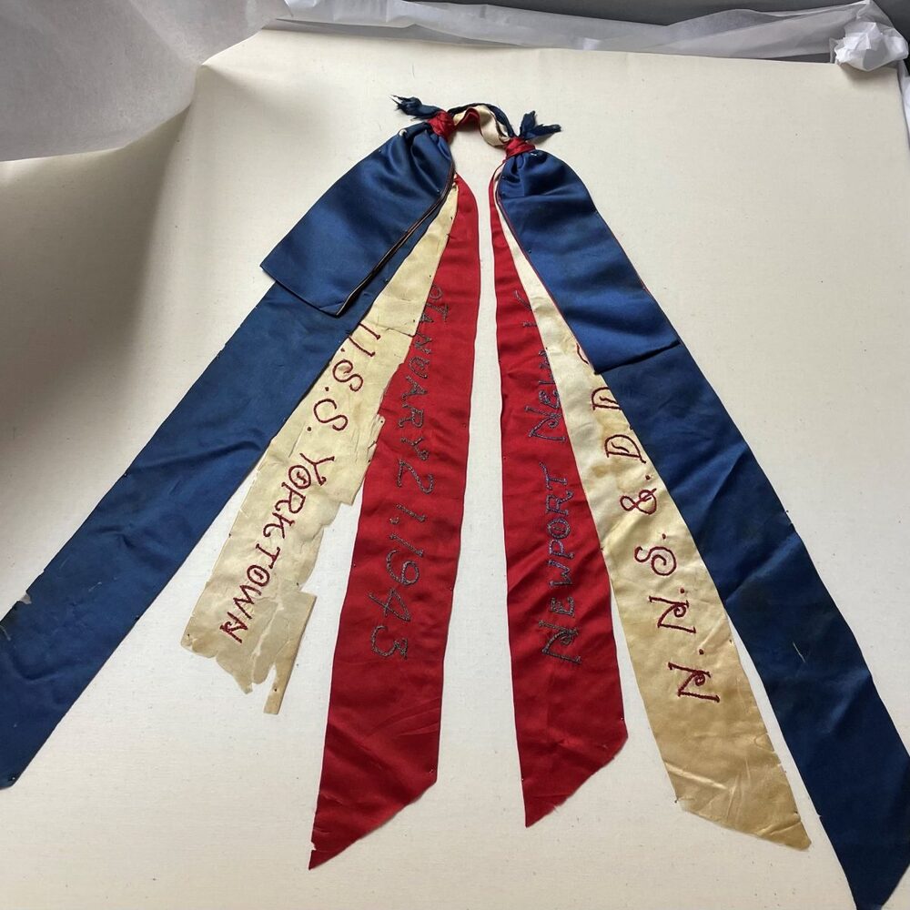 The items featured in the exhibit are primarily from World War II and hand-selected by the museum curator. Artifacts include the ribbons from the champagne bottle used by Eleanor Roosevelt (right) to christen the USS Yorktown, the American flag that flew aboard the USS Laffey on D-Day, and fragments from kamikaze aircraft that struck U.S. ships in the Pacific Theater.