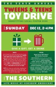 Interested parties can stop by The Southern between 2 pm to 4 pm to donate gifts. Anyone that brings a gift, will get a free drink! Plus, local band Sideshow Americans will perform during the event.