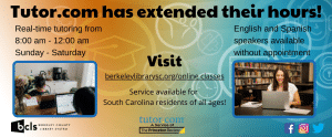 BCLS also provides Online Classes such as Tutor.com under Digital Library which is open to South Carolina adult learners and students K-12 and offers many subjects in English and Spanish.