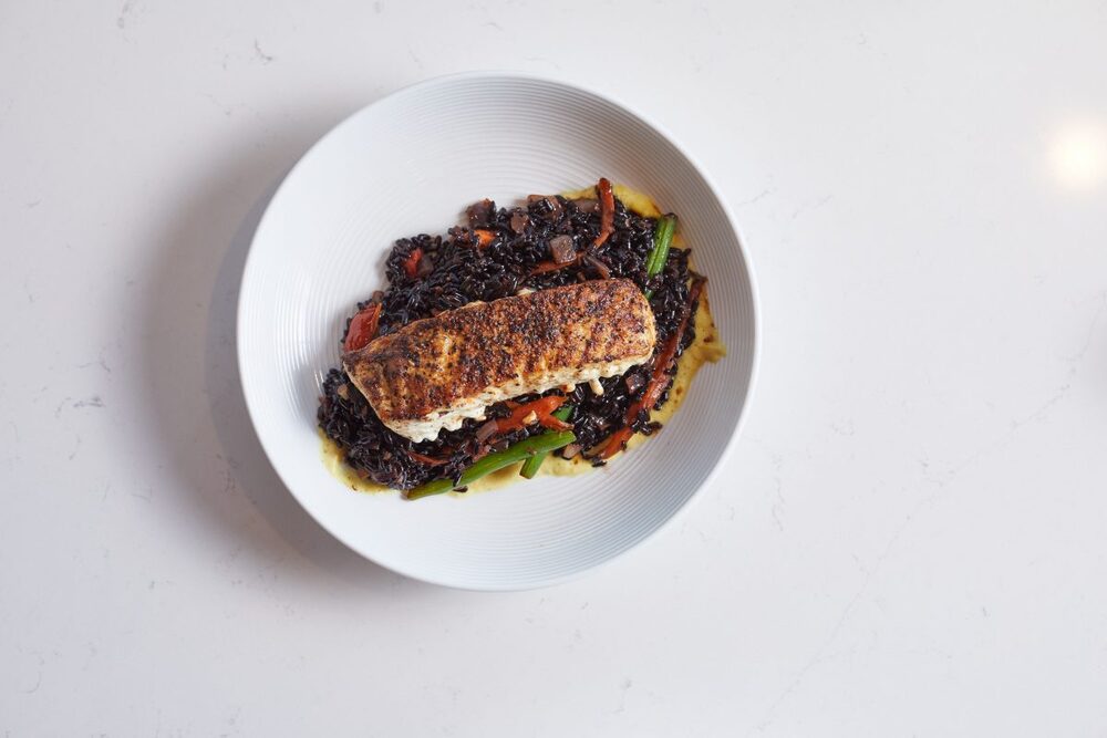 Fresh Catch (right) – Soy Glazed Forbidden Rice, Baby Carrots, Haricot Vert, Golden Beet Puree