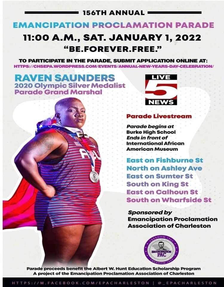The 156th Annual Emancipation Proclamation Parade will take place on Saturday, January 1, 2022 and feature Olympic Silver Medalist Raven Saunders as Parade Grand Marshal. The Charleston celebration has been held on New Year’s Day since 1866 and is considered the nation’s oldest parade commemorating the Emancipation Proclamation.