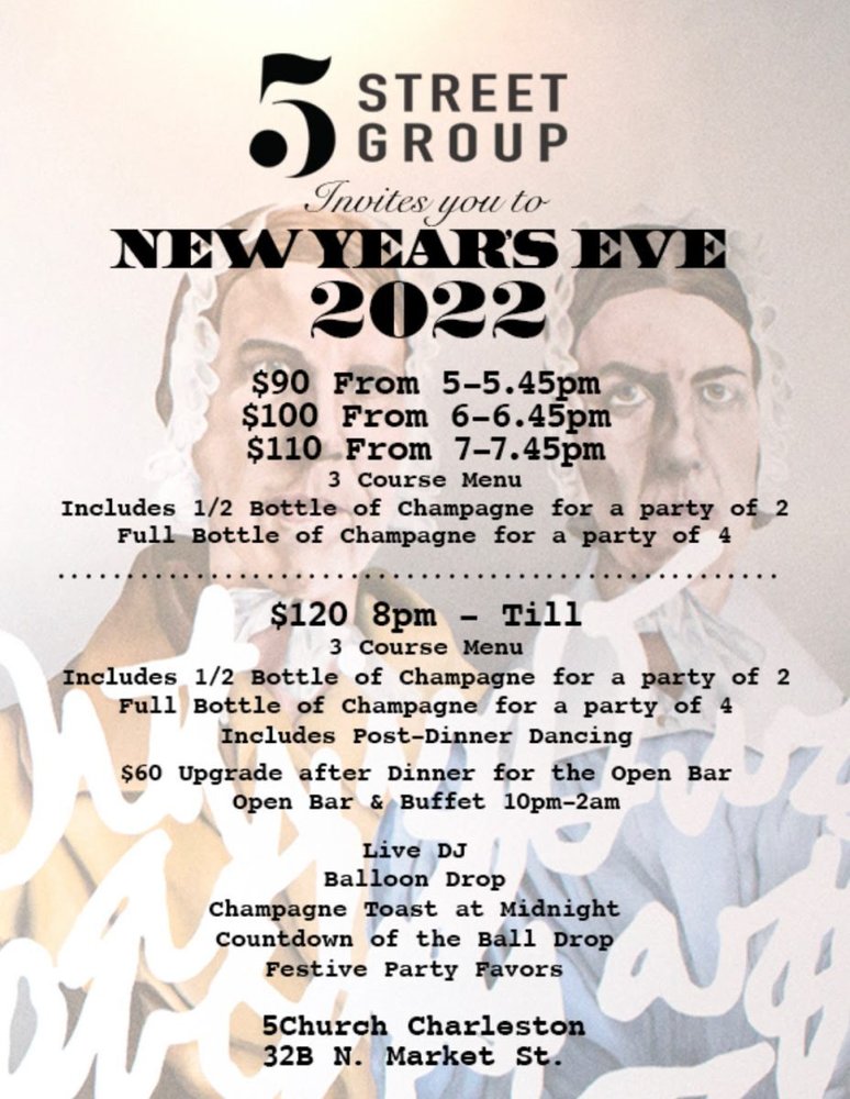 - Celebrate with balloons, music and bubbles at 5Church Charleston’s late-night New Years Eve bash