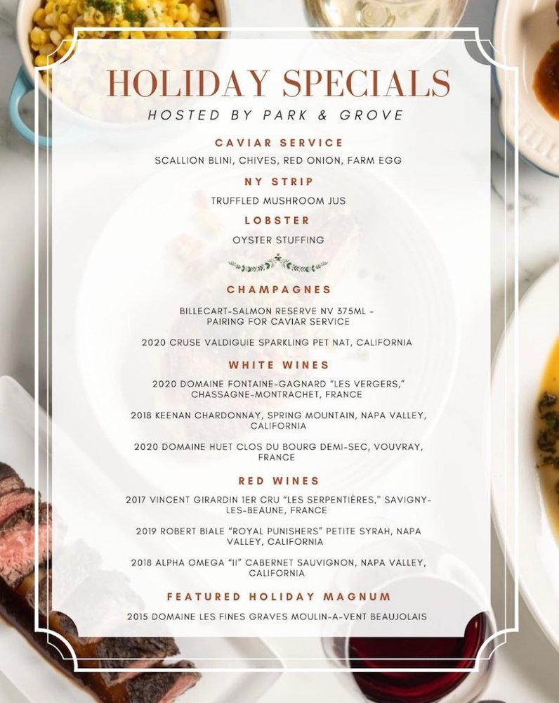 - Families and friends can enjoy a premier Caviar service (complete with scallion blini, chives and farm egg), New York Strip Steak with truffled mushroom jus, and Lobster with oyster stuffing, in addition to Park & Grove’s regular menu