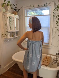 In this class you’ll learn a new skill while creating items to help you cultivate a self care routine at home. You’ll learn the fundamentals of using indigo dye from beginning to end and dye a one-size-fits-most terry towel bath wrap and spa headband – perfect for at home facials, saunas, gym coverups, and more.