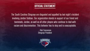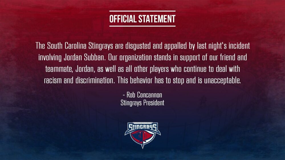 “The South Carolina Stingrays are disgusted and appalled by last night’s incident involving Jordan Subban,” Stingrays team president Rob Concannon said in a statement. “Our organization stands in support of our friend and teammate, Jordan, as well as all other players who continue to deal with racism and discrimination. This behavior has to stop and is unacceptable.”