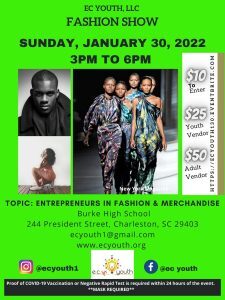 Entrepreneur Centers 4 Youth (EC Youth) will host its Entrepreneurs in Fashion and Merchandise Fashion Show on Sunday, January 30, 2022 from 3-6 PM at Burke High School (244 President Street, Charleston, SC 29403). Event attendees will learn about the fashion and merchandise industry through entrepreneurial speakers, which is one of the most important highlights of EC Youth’s entrepreneurial events, along with financial literacy as the core focus.