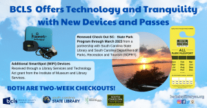 BCLS has also renewed its Check Out SC: State Park Program through March 2023 from a partnership with South Carolina State Library and South Carolina Department of Parks, Recreation & Tourism (SCPRT) with 20 additional State Park Passes. Each pass will give customers free day-entry per vehicle to all 47 South Carolina State Parks with a two-week checkout period. Visit BCLS catalog and search for SC Pass for a complete list of all 47 Parks. South Carolina Passes can be placed on hold and picked up in the libraries or curbside pick-up.