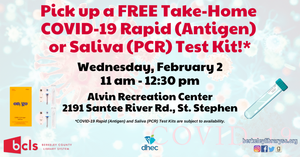 Berkeley County Library System (BCLS) will distribute FREE Take-Home COVID-19 Rapid (Antigen) or Saliva (PCR) Test Kits on Wednesday, February 2, 2022 from 11 am – 12:30 pm. The event will take place at the Alvin Recreation Center located at 2191 Santee River Rd in St. Stephen. Library customers are invited to attend.