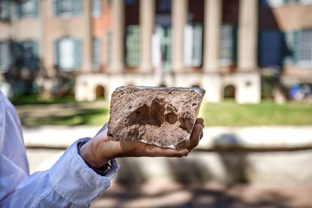 A brick from the College of Charleston with a full fingers indented into the interior brick by the brickmaker most likely a person of color who was a slave.