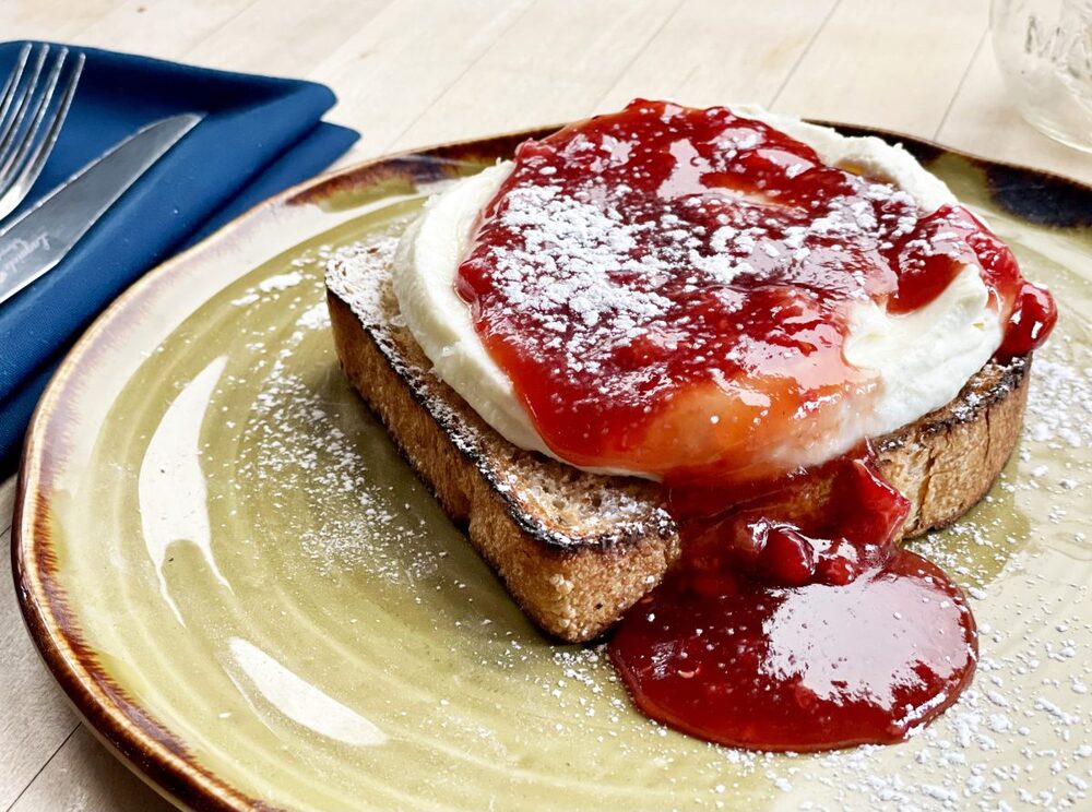- Ricotta Toast (right) topped with whipped ricotta, local jam, and sea salt