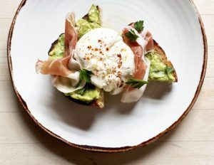 - Burrata Toast (below) with smashed avocado, proscuittio di parma, EVOO, and Aleppo pepper