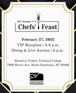 Lowcountry Food Bank (LCFB) announced today that its 23rd annual Chefs’ Feast gala will be held on Sunday, February 27th, 2022 at 6 pm, at the Trident Technical College Thornley Campus at 7000 Rivers Avenue in North Charleston. Event guests can also participate and fight hunger at Chefs’ Feast virtually – stay tuned for more details about virtual participation.