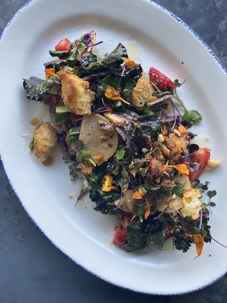 - Local Strawberry salad, pickled Asian Pear, kalettes, croutons, herbs, flowers, white balsamic vinaigrette