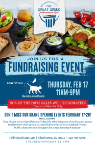 - February 17th: Charity fundraising event benefiting Charleston Animal Society, where 50 percent of net sales for the day will be donated to the nonprofit to aid in the prevention of animal cruelty.