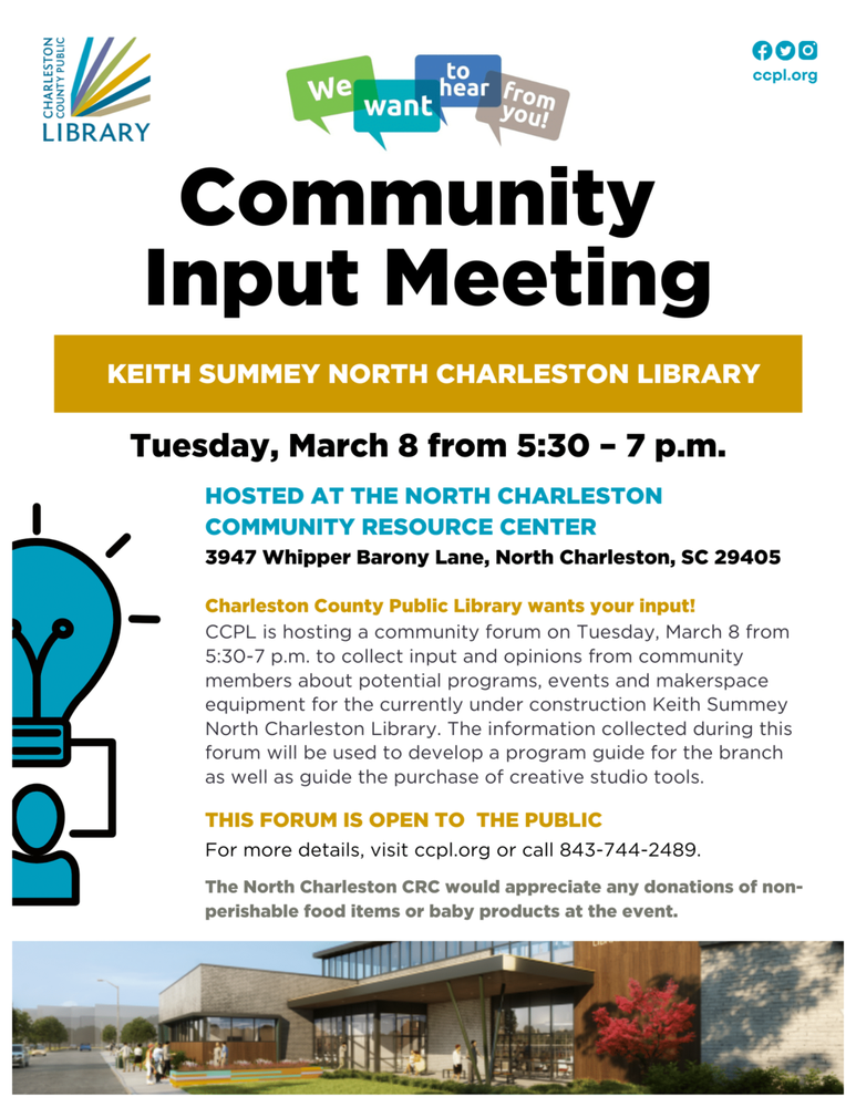 Charleston County Public Library (CCPL) wants your input! CCPL is hosting a community forum on Tuesday, March 8th from 5:30-7 p.m. to collect input and opinions from community members about potential programs/events and makerspace/creative studio equipment for the Keith Summey North Charleston Library, which is currently under construction. The information collected during this forum will be used to develop a program guide for the branch as well as guide the purchase of creative studio tools. The new library is anticipated to open later this year.