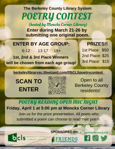 - On Friday, April 1, 2022, BCLS Moncks Corner Library will host a Poetry Reading/Mic Night. Winners in each category will be invited to read their poems.