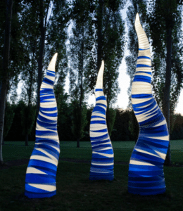 “Troika” is comprised of three blue and white spires that appear to emerge from the earth. The spires are made from welded industrial plastic debris, including old barrels and bins, taken from the waste stream. The spires have an internal glow at night from solar powered lights located in its spines. The sculptures’ forms reference how plants grow in a meandering fashion, but ultimately towards the light. “Troika” also speaks to the potential of shifting the direction of earth’s downward spiral of waste into an upward spiral of innovation.