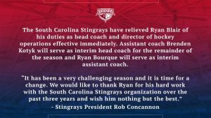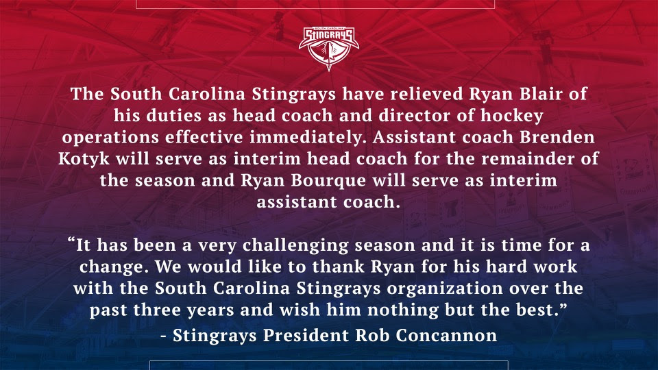 “It has been a very challenging season and it is time for a change,” said Stingrays President Rob Concannon. “We would like to thank Ryan for his hard work with the South Carolina Stingrays organization over the past three years and wish him nothing but the best.”