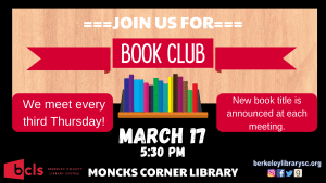 The Moncks Corner Book Club provides a comfortable space in the Activity Room to meet other book lovers and discuss the current book selection. The new title will be announced at the March 17th meeting.