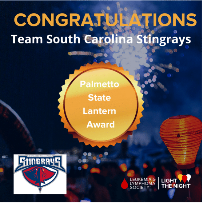 The South Carolina Stingrays have been honored with the Palmetto State Lantern Award for the second straight year after raising $6,280 for the Lowcountry Leukemia & Lymphoma Society through Night The Light.