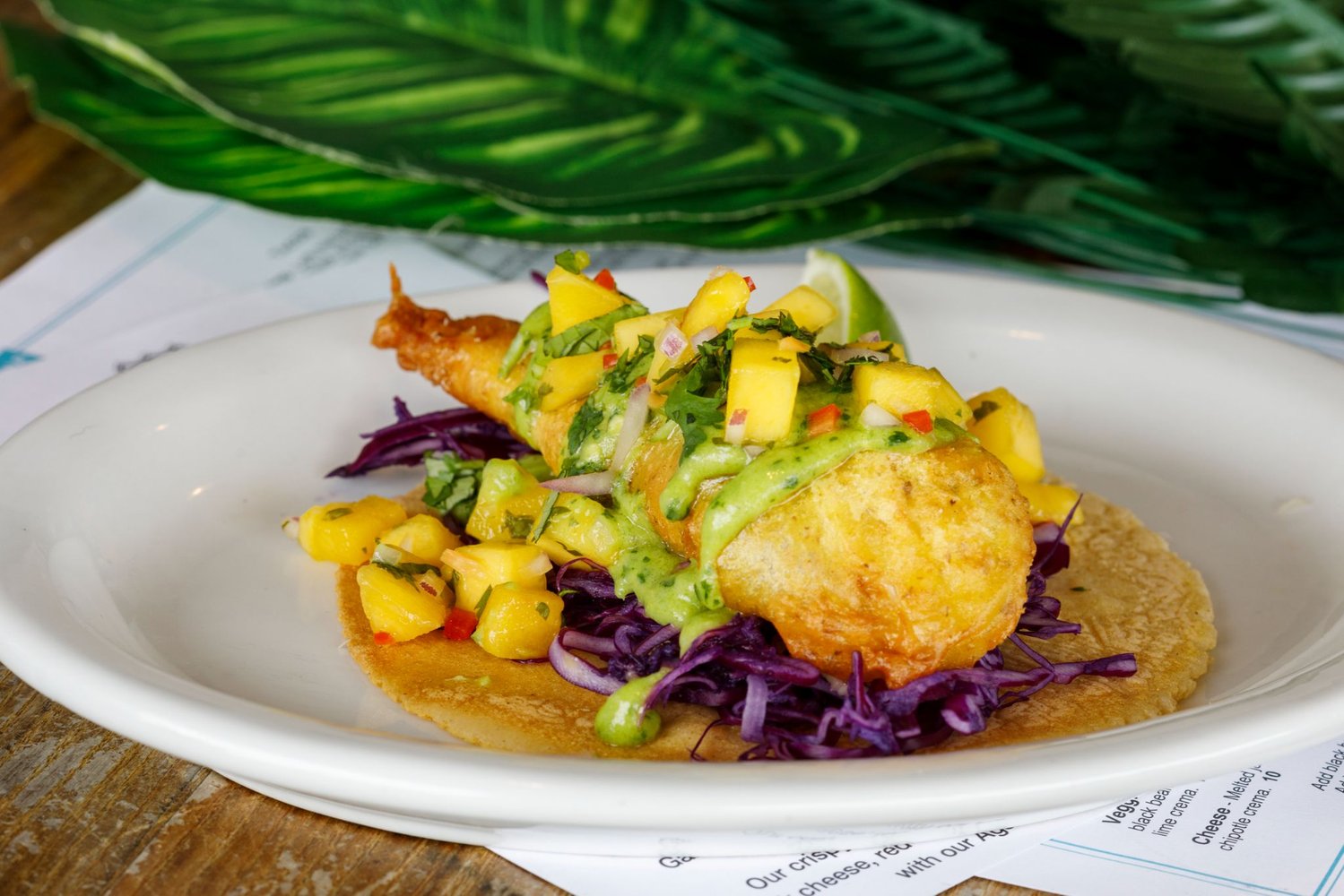 The Thunderbomb Taco consists of lightly fried seasonal fish in a Baja batter with shredded red cabbage, housemade guacamole sauce, and fresh pineapple salsa.