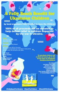Every dollar collected will be donated directly to the nonprofit organizations Save the Children and UNICEF for their Ukrainian efforts. There will be no shortage of opportunities to donate – raffles, a live auction, food and beverage purchases. There will also be live music and an area for children to play. Food will be available from multiple Folly Beach restaurants.