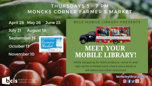 “The Berkeley County Mobile Library will be attending the Moncks Corner Farmer’s Market one Thursday per month starting in April,” said Elizabeth Baker, Mobile Outreach Specialist. “The community is welcome to stop by, pick up a children’s take-home craft, sign up for a library card if you don’t already have one, and choose from books, movies, and more to check out.”
