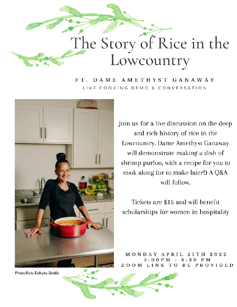 Dame Amethyst Ganaway will demonstrate how to make shrimp purloo with a shared recipe for attendees to cook along or make later. A Q&A session will follow.