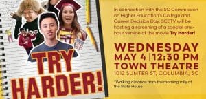 Rally attendees will make their way to Town Theater in Columbia, SC for the screening of Try Harder!, which will be followed by a panel discussion from CHE College Process Ambassadors– high school seniors from across the state who work with their fellow students to help them through the college preparation and application process.