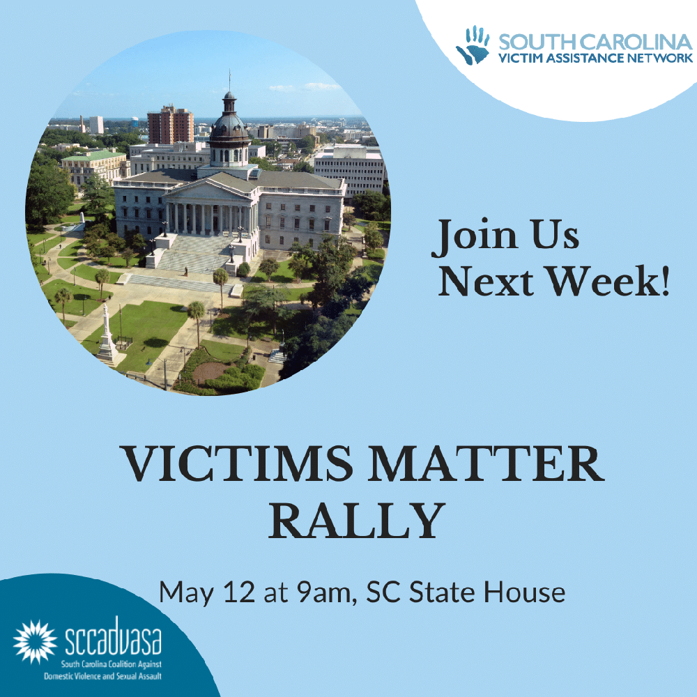 The rally will begin at 9 am and will include speakers from the entirety of the sexual assault experience in South Carolina. Additionally, survivors and advocates will be invited to lobby members of the South Carolina General Assembly to focus attention and motivate action in regards to how these crimes are handled by the criminal justice system, calling for a more trauma-informed and victim-centered approach.