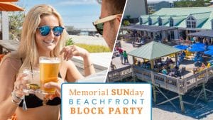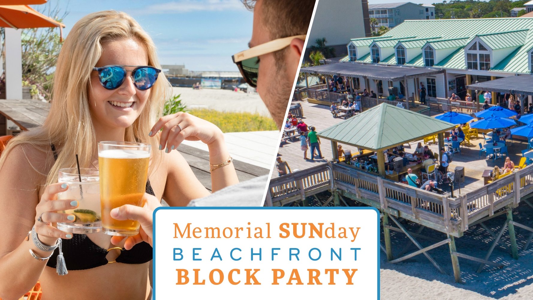 The Memorial SUNday Beachfront Block Party starts at 2 pm and includes live music from DJ Marsico, Super Reggae Man, and The Quentin Ravenel Experience. There will also be $8 drink specials and prizes.