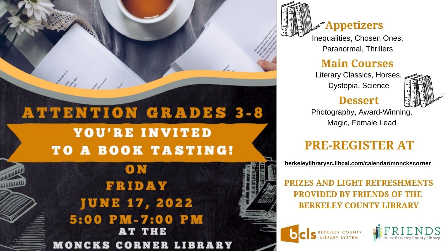 Berkeley County Library System (BCLS) announces a Book Tasting for third-eighth grade students on Friday, June 17th, 2022 from 5 pm to 7 pm at the Moncks Corner Library.